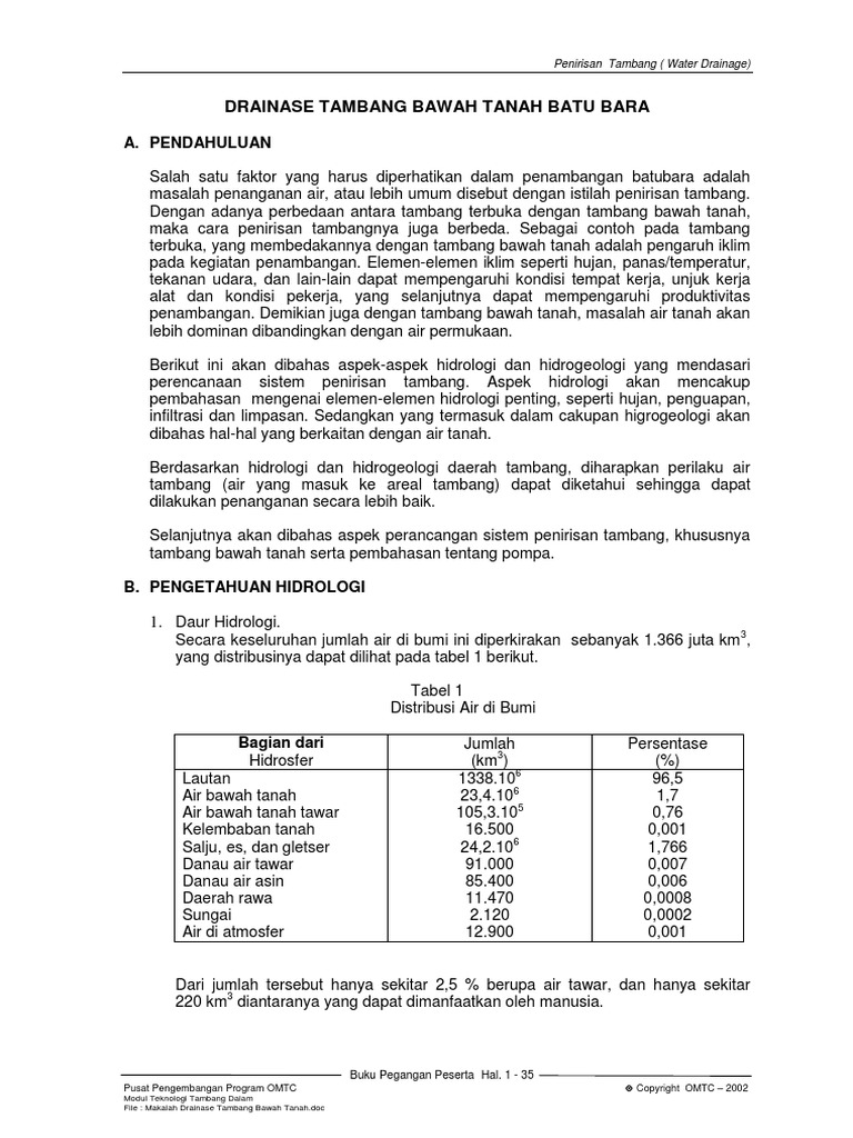 Makalah drainase tambang bawah tanah.doc. Mendeteksi dan menangani masalah yang disebabkan oleh masuknya air. Menyingkirkan debu yang berada dalam aliran ventilasi tambang bawah tanah hingga ambang. Makalah drainase tambang bawah tanah.pdf. Untuk mengetahui apa itu ventilasi alamib.